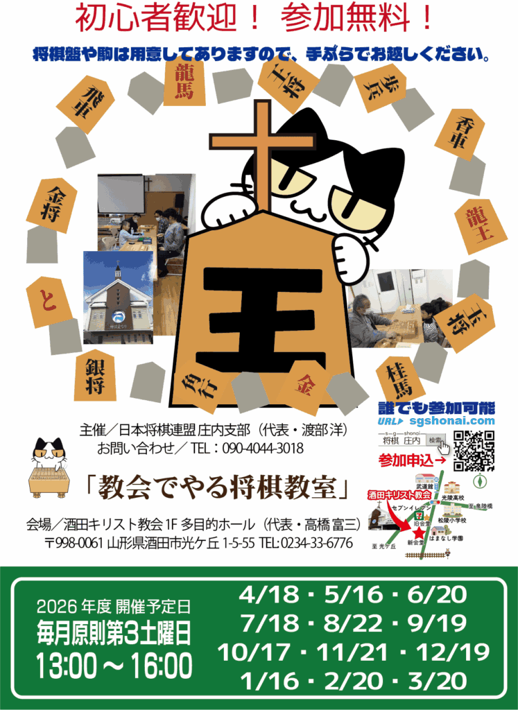 | 3/20 (土) | 13:00-16:00 | 酒田キリスト教会 多目的ホール | 子ども将棋教室 |